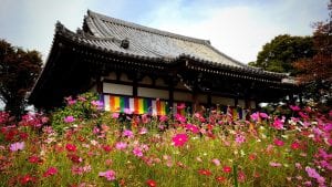 Храм Рёандзи с подлинным чудом света – Садом камней. Пятнадцать камней в саду расположены таким образом, что с какой-бы стороны не посмотреть, всегда можно видеть только четырнадцать камней. Философы дзен-буддизма усмотрели в этом глубокий смысл. Все камни может увидеть лишь постигнувший истину, воспарив над садом…. Не только камнями знаменит этот сад, весной главный объект созерцания и поклоненияв редкой красоты сакура.